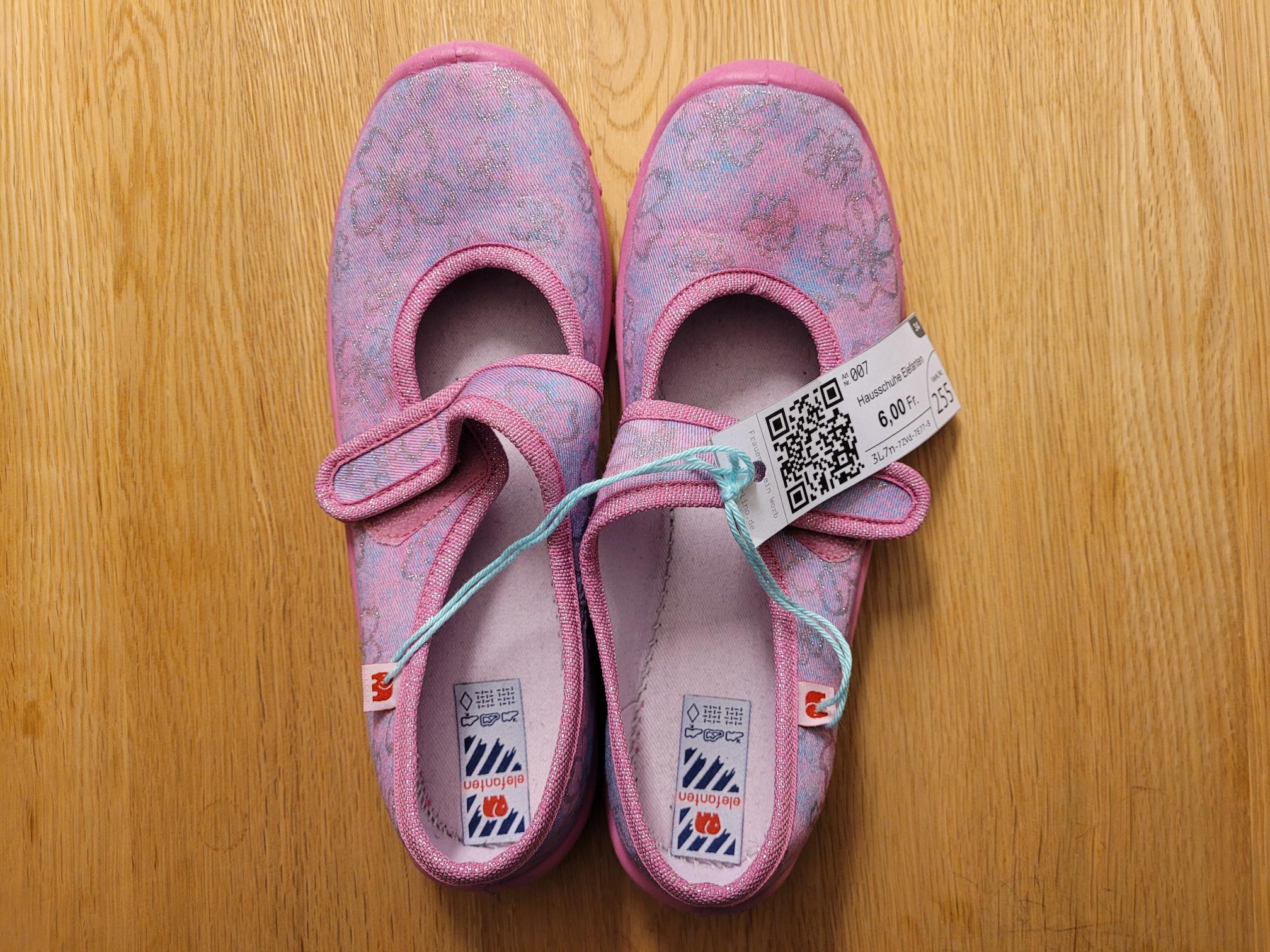 Die Etikette mit dem QR-Code mit einer Schnur gut am Artikel befestigen. Schuhe zusammenbinden und eine Etikette befestigen.